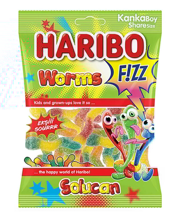 Haribo Ekşi Solucan Yumuşak Şekerlemeyi arkadaşınla paylaş, eğlenceyi katla! Renkli ve lezzetli yumuşacık şekerlemeleri hem çocuklar hem büyükler çok seviyor.