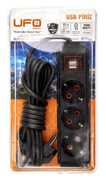 Ufo 3'lü 2.5 Metre USB'li Grup Priz Siyah