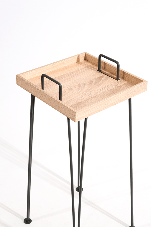 Ahşap ve metal materyallerden üretilen sehpa çıkarılabilir bir ahşap tepsiye sahiptir.