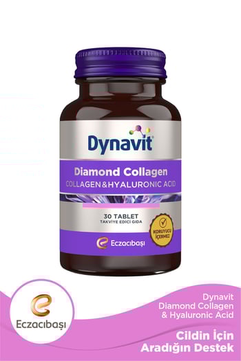 Dynavit Diamond Collagen & Hyaluronic Acid Nedir?: Dynavit Diamond Collagen & Hyaluronic Acid; 750 mg Tip I Hidrolize Kollajen içeren 150 mg Hyaluronik Asit, 40 mg Resveratrol ve 20 mg Nar Meyve Kabuðu Ekstresi ile zenginleþtirilmiþ tablet formda gýda takviyesidir.