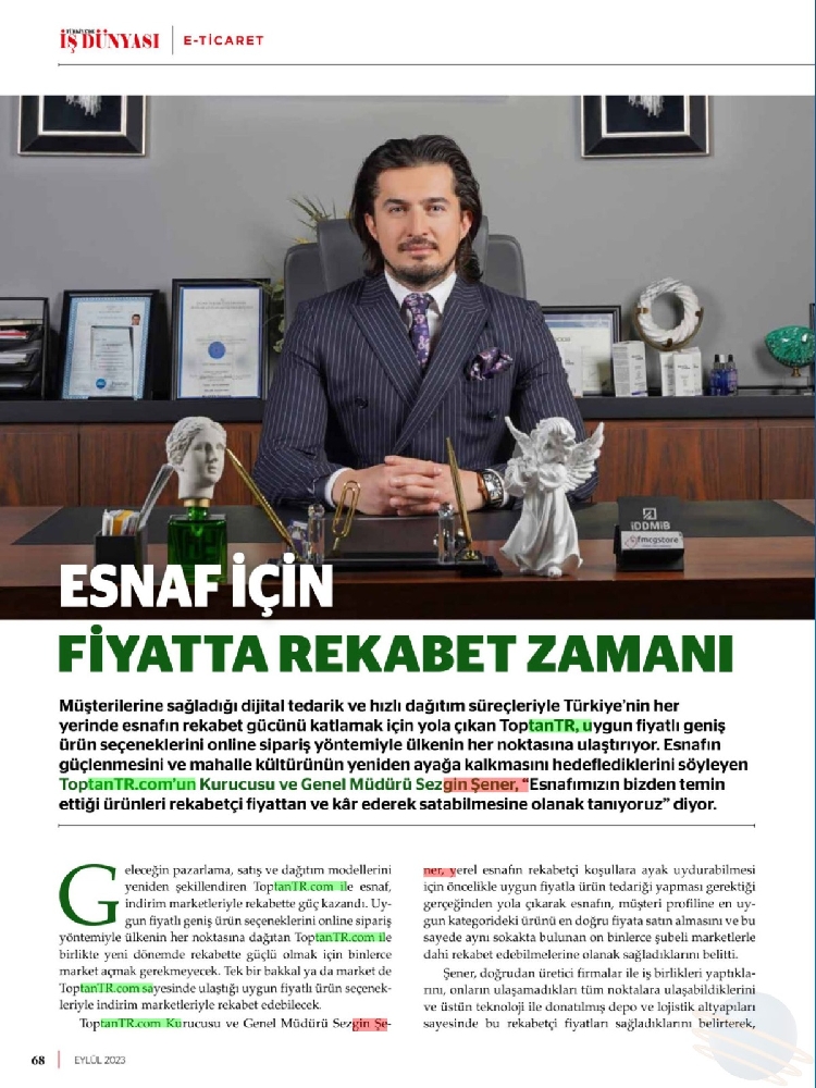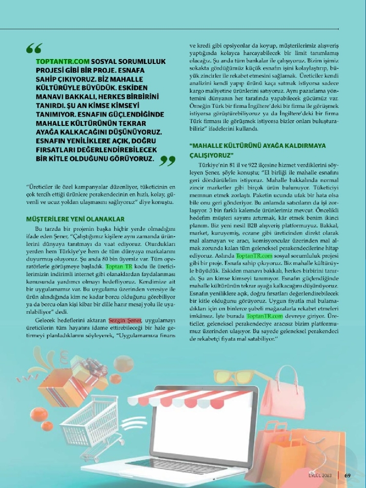 Müşterilerine sağladığı dijital tedarik ve hızlı dağıtım süreçleriyle Türkiye'nin her yerinde esnafın rekabet gücünü katlamak için yola çıkan ToptanTR, uygun fiyatlı geniş ürün seçeneklerini online sipariş yöntemiyle ülkenin her noktasına ulaştırıyor. Esnafın güçlenmesini ve mahalle kültürünün yeniden ayağa kalkmasını hedeflediklerini söyleyen ToptanTR.com'un kurucusu ve Genel Müdürü Sezgin Şener, "Esnafımızın bizden temin ettiği ürünleri rekabetçi fiyattan ve kâr ederek satabilmesine olanak tanıyoruz" diyor.