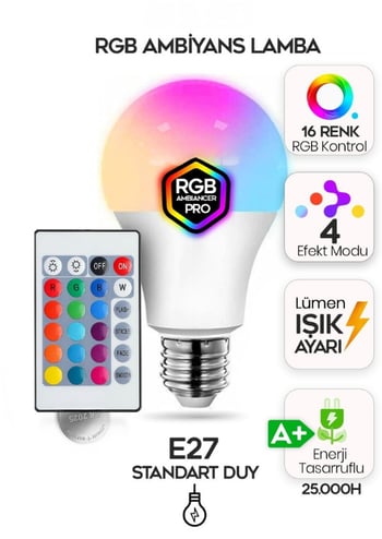 Kumandalı RGB LED ampul, 16 farklı renk seçeneği ve ışık modu ile dekoratif ambiyans yaratır. E27 uyumu sayesinde kolay montaj ve geniş kullanım alanı sunar.