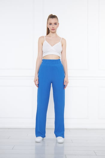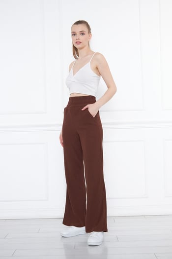 Beli Lastikli Bol Paça Çift Cepli Yüksek Bel Bürümcük Örme Kadın Pantolon