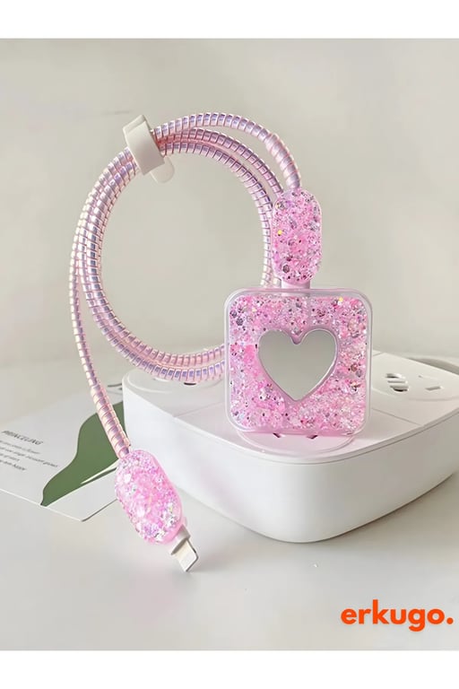 iPhone 18/20 W Şarj Cihazı Uyumlu 5 Parça Şarj Koruma Seti, Kablo Koruyucu EKG-K-1simli_pembe_kalp
