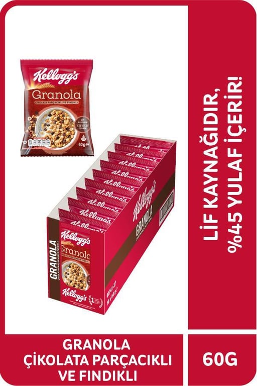Kellogg's Çikolata Parçacıklı&Fındıklı Granola 60 Gr x10 Adet,%44
