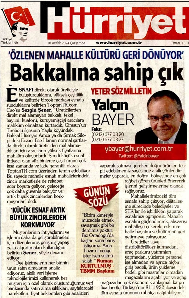 Giresun’un Tirebolu ilçesinin Yayla köyündeki Bakkal Hüseyin Amca ya da Şırnak Silopi’deki Eczacı Ece Hanım normal şartlarda direkt olarak üreticiden mal alamadıkları için aracıların yüksek fiyatlarına mahkûm oluyorlardı. Şimdi küçük esnaf ihtiyacı olan yüz binlerce çeşit ürünü çok kısa zamanda ve iade garantili olarak ToptanTR.com üzerinden temin edebiliyor. Bu sayede mahalle esnafı mahallelerindeki zincir marketlerle de rekabet eder boyuta geliyor, geleceğe çok daha güvenle bakıyor ve artık büyük zincirlerden korkmuyorlar” dedi.