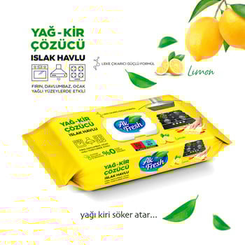 Akfresh Yağ Kir Çözücü Islak Havlu Limon 85’li, taze limon kokusu ve güçlü formülüyle yağ ve kirleri kolayca temizler, ferahlık sağlar.