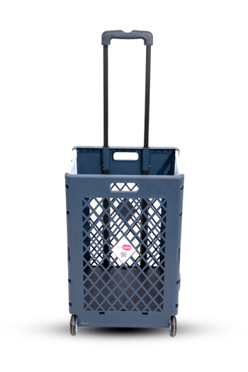 34 L plastik tekerlekli alışveriş sepeti.