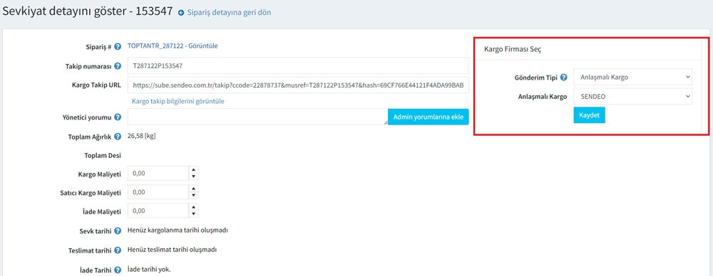 ToptanTR Pazaryeri, entegrasyonu bulunan kargo firmaları ile çalışan satıcıların gönderileri için her sipariş için otomatik olarak bir sevkiyat oluşturacak ve bu sevkiyata bir kargo takip numarası verecektir. ToptanTR Pazaryeri'nin anlaşmasını kullanmanız şart değildir, dilerseniz kendi anlaşmanızı kullanabilirsiniz ama takip numarası, mümkün olduğu her durumda, ToptanTR Pazaryeri tarafından üretilir. Eğer ToptanTR Pazaryeri'nin entegrasyonu olmayan bir kargo firması kullanmıyor ya da lojistiğinizi kendiniz sağlıyorsanız sevkiyatlarınızın kargo takip no, kargoya verildi ve teslim edildi bilgilerini kendiniz sağlamalısınız.