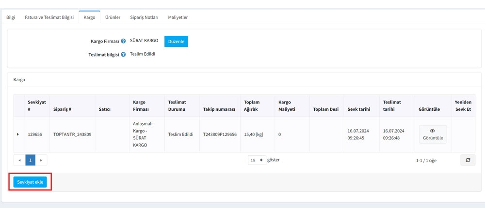 Ardından sipariş detayında Kargo sekmesine gelerek "Sevkiyat Ekle" butonunu kullanabilirsiniz. Eski sevkiyattan çıkardığınız ürünleri içeren yeni bir sevkiyat otomatik olarak oluşacaktır.