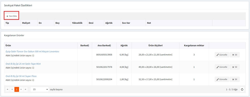 Çoklu paket içeren gönderileriniz için sevkiyat detayında yer alan "Yeni Ekle" butonunu kullanabilirsiniz. Bu sayede birden fazla paket içeren gönderileriniz için aynı takip kodunu kullanan ama her paketi ayrı ayrı takip etmeyi sağlayan çoklu kargo etiketleri bastırabilirsiniz.