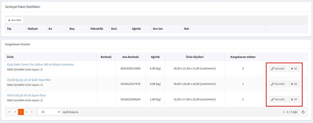 Eğer bir sevkiyatı ikiye bölerek tamamen yeni bir sevkiyat oluşturmanız gerekirse, yeni sevkiyata aktarmak istediğiniz ürünleri "Kargolanan Ürünler" kısmını düzenleyerek mevcut sevkiyattan çıkarmalısınız.