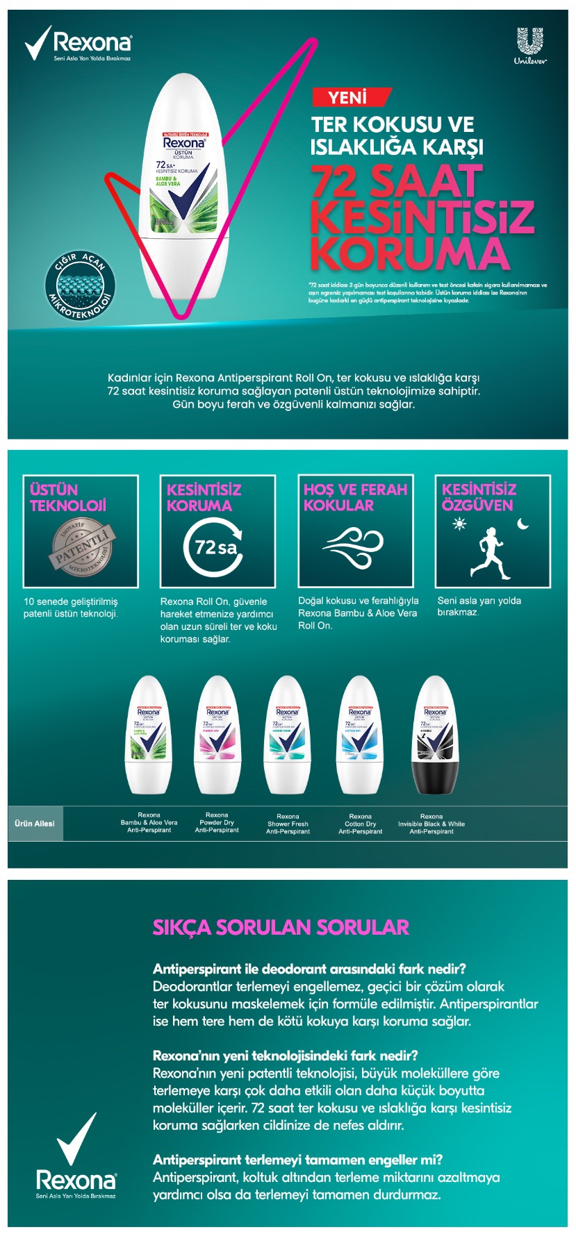 Rexona Bamboo & Aloe Vera Roll On ile günlük yaşamın koşturmacası içerisinde güvende hissetmeye var mısınız? Ter kokusuna ve ıslaklığa karşı 72 saat** boyunca kesintisiz koruma sunan Rexona’nın yeni formülü her adımda güvenli ve ferah bir deneyim sunuyor. Her kullanımda, güvenle adım atmanız için güçlü bir koruma sağlayan Rexona Bamboo & Aloe Vera Roll On, ter kokusunu ve ıslaklığı 72 saat** boyunca etkili bir şekilde kontrol altına alır. Artık endişelenmeden hareket edebilir, özgüvenle gününüzü geçirebilirsiniz. Ürünümüz içeriğindeki özel formül ve üstün teknoloji* sayesinde bambu ve aloe vera özleri ile cildinizi ferahlatır, kullanım sonrasında geride hoş bir koku bırakır. Sekiz farklı roll-on seçeneğiyle de her zevke uygun bir seçenek sunarken, hoş ve ferah kokularıyla da taze ve enerjik hissetmenizi sağlar. Rexona Bamboo & Aloe Vera Roll On ter kokusuna ve ıslaklığa karşı etkisinin yanı sıra aynı zamanda kesintisiz hareket ve özgüven vaat eder. Her adımda kendinizi güvende hisseder ve günün tadını çıkarabilirsiniz. Rexona Bamboo & Aloe Vera Roll On ile her anınızı kesintisiz hareket, kesintisiz özgüven ve kesintisiz koruma ile taçlandırın. Rexona olarak, sizin yanınızda olmaktan ve günlük yaşamınızı daha kolay ve keyifli hale getirmekten mutluluk duyuyoruz. Yoksa siz hala yeni formülümüzü denemediniz mi? * Rexona’nın bir önceki antiperspirant teknolojisine göre. ** 72 saat iddiası 3 gün boyunca düzenli kullanım ve test öncesi kafein sigara kullanılmaması ve aşırı egzersiz yapılmaması test koşullarına tabidir.