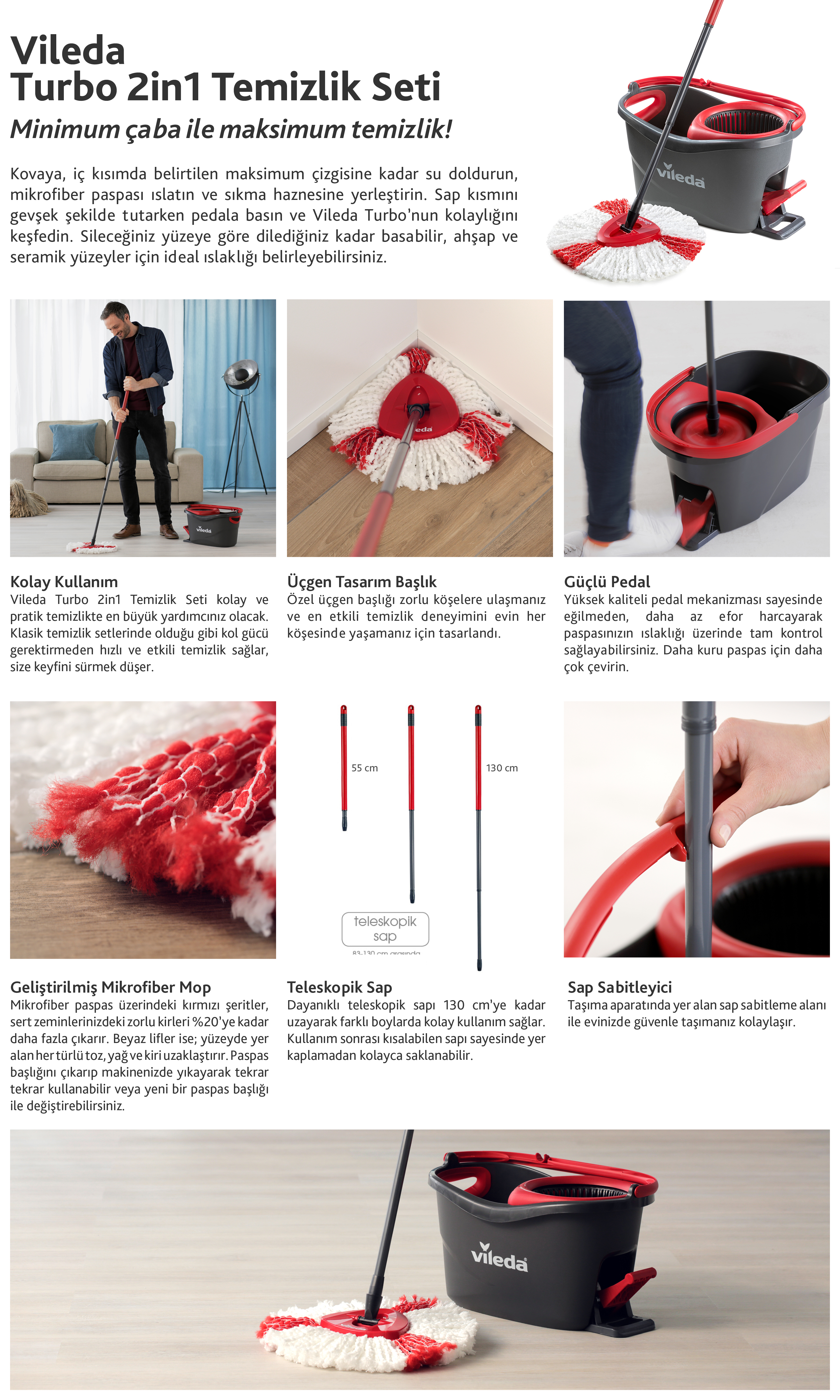 Vileda Turbo 2in1 Temizlik Seti kolay ve pratik temizlikte en büyük yardımcınız olacak. Klasik temizlik setlerinde olduğu gibi kol gücü gerektirmeden hızlı ve etkili temizlik sağlar, size keyfini sürmek düşer. Dakikada 1000'den fazla dönebilen sıkma sistemi temizliği zahmet, kolay ve hızlı hale getirir.