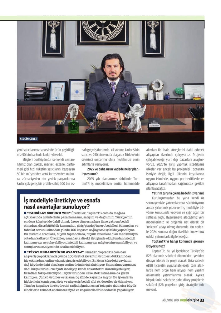 Kurucumuz ve CEO'muz Sezgin Sener, Kobi Girişim dergisinin Ağustos sayısında verdiği söyleşide, Türkiye’deki küçük esnaflara iade garantili ve aracısız ticaret imkânı sunarak, hem yerel üreticilerin hem de esnafın zincir marketlerle rekabet edebilmesini sağlayan yenilikçi B2B online pazaryeri iş modeli sayesinde, yıl sonuna kadar 5 bin satıcı ve 250 bin işletmeye ulaşma hedefiyle büyümeyi sürdüreceklerini belirtti.