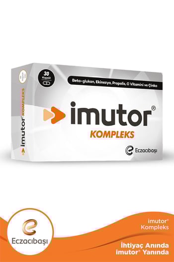 • Eczacıbaşı Imutor Kompleks 30 Kapsül Beta Glukan, Ekinezya, Propolis, C Vitamini ve Çinko İçeren Takviye Edici GıdaÇinko ve C vitamini bağışıklık sisteminin normal fonksiyonuna katkıda bulunur