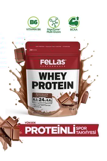 • Fellas Çikolata Aromal ı Whey Protein Tozu; her porsiyonda 24g y üksek protein, 6.2g BCAA ve 4.4g L-Glutamine içerir. DigeZyme ® multi enzim kompleksi ve Vitamin B6 ilaveli formülüyle öne ç ıkar. Çikolata aromas ıyla lezzetli bir protein desteği sunar. 175 g’lık deneme boyu paket, whey protein tozunu ilk kez kullanmak isteyenler i çin ideal bir seçenektir.